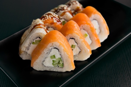 Рис, нори, лосось, креветки тигровые, сливочный сыр, огурец.